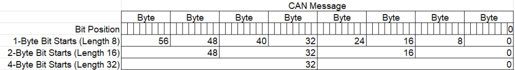 - If Battery Voltage is stored in byte 7, the bit start will be 56, and the bit length will be 8.